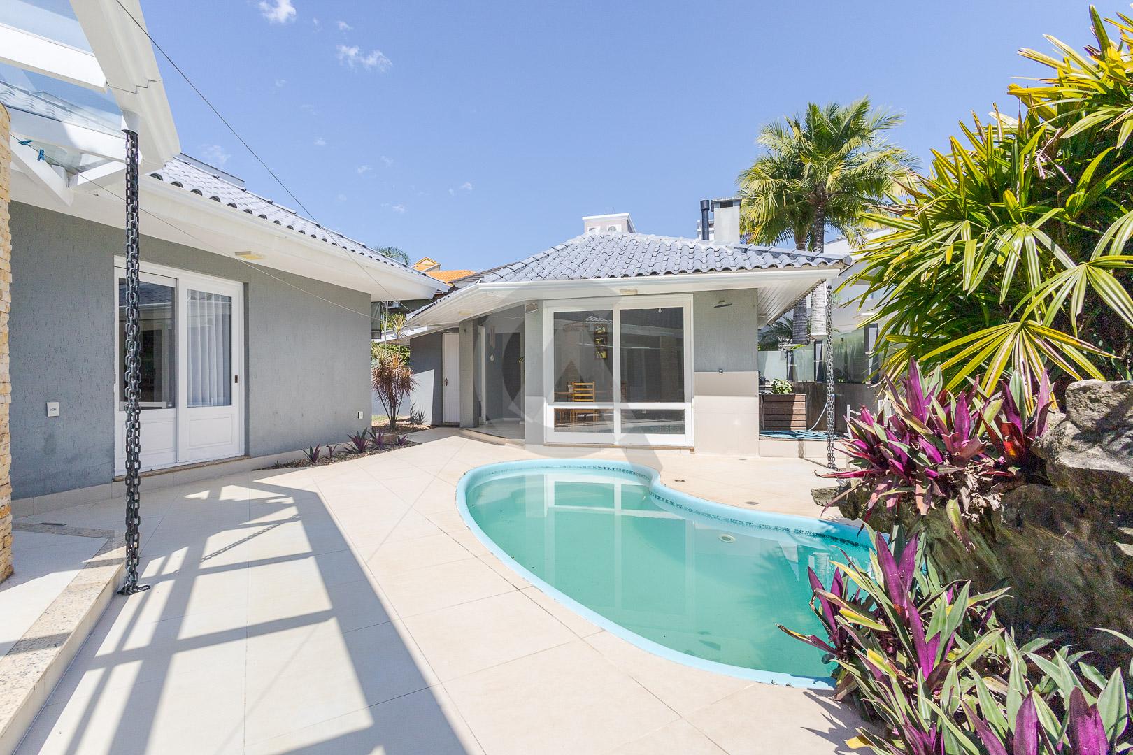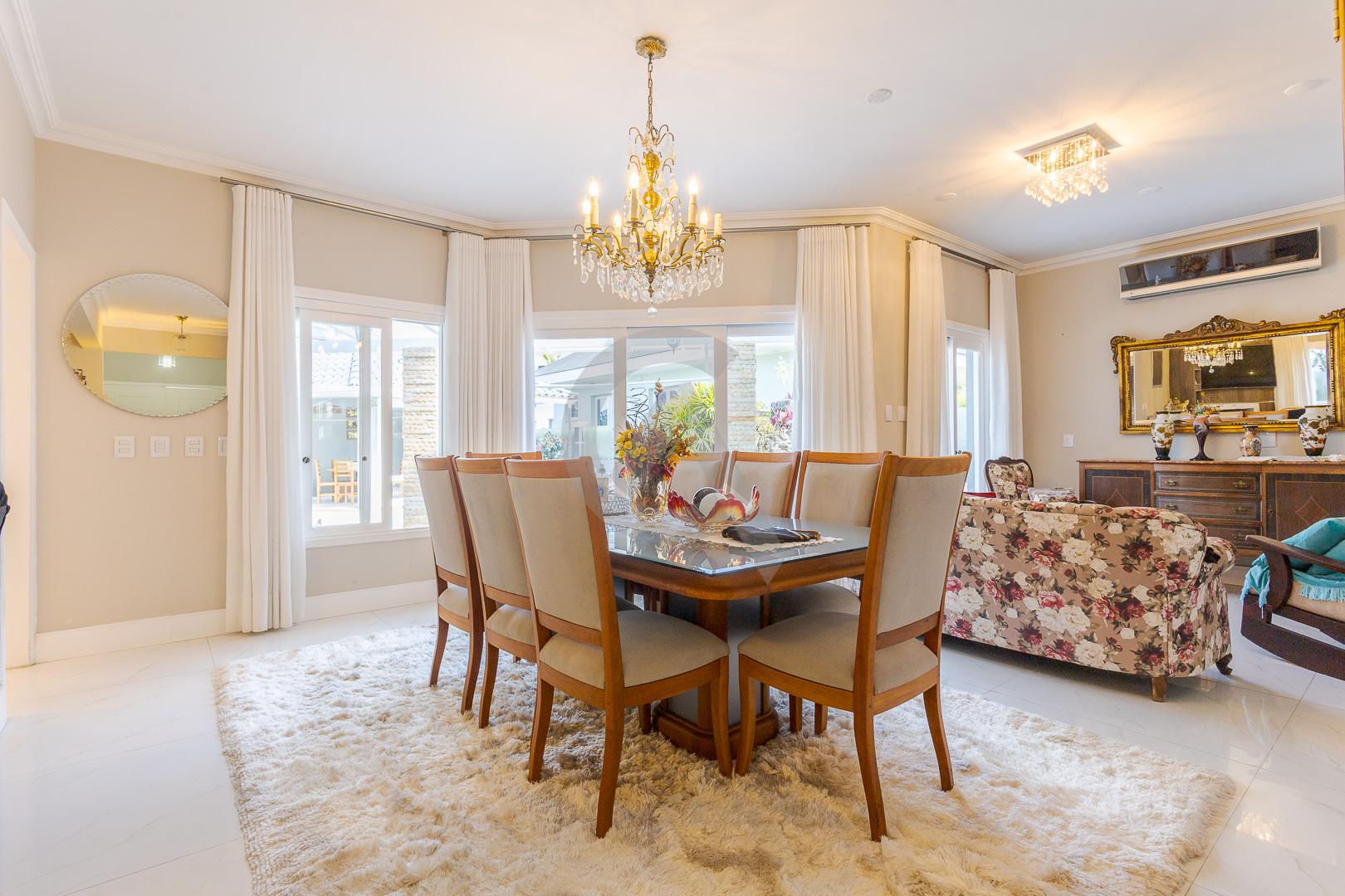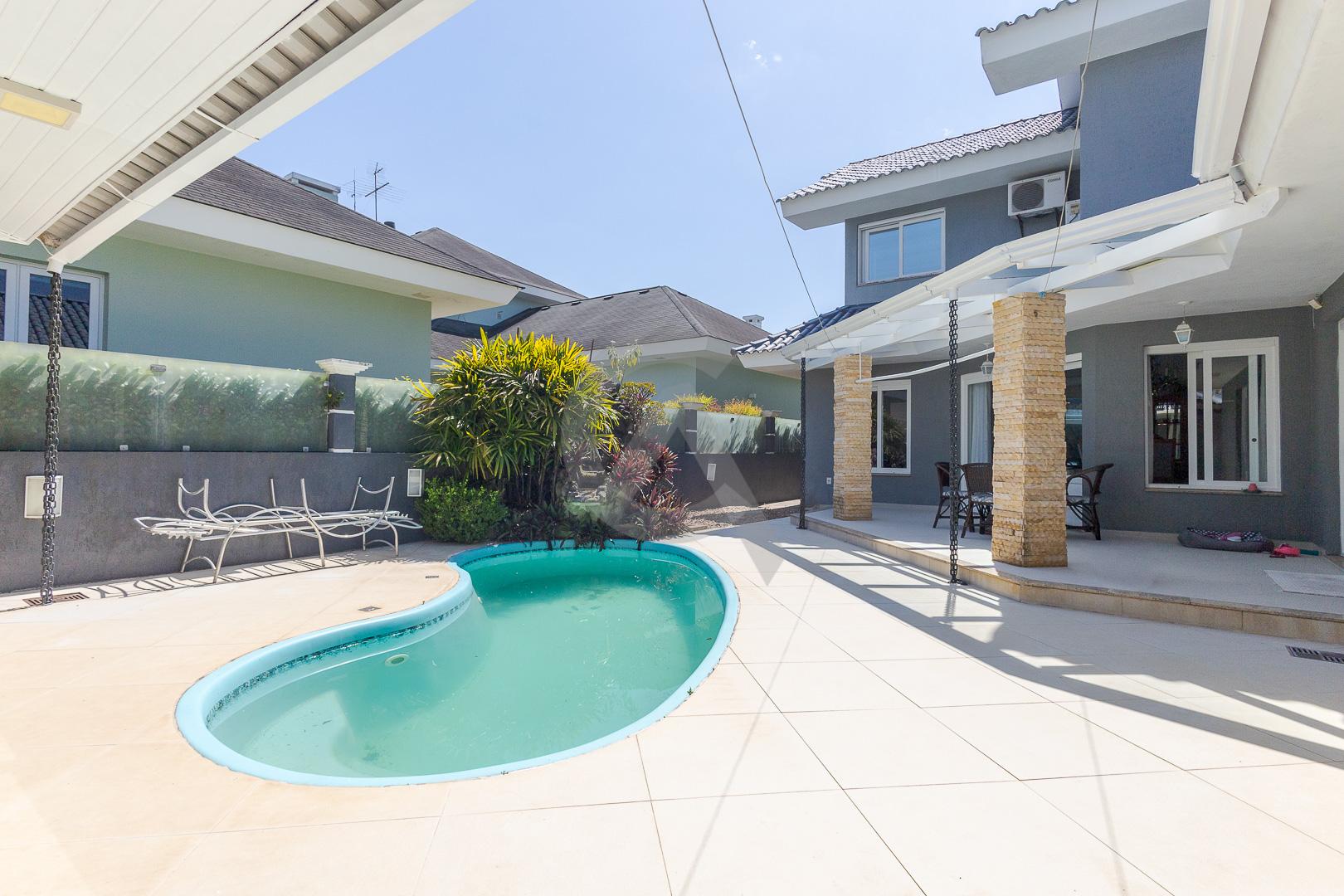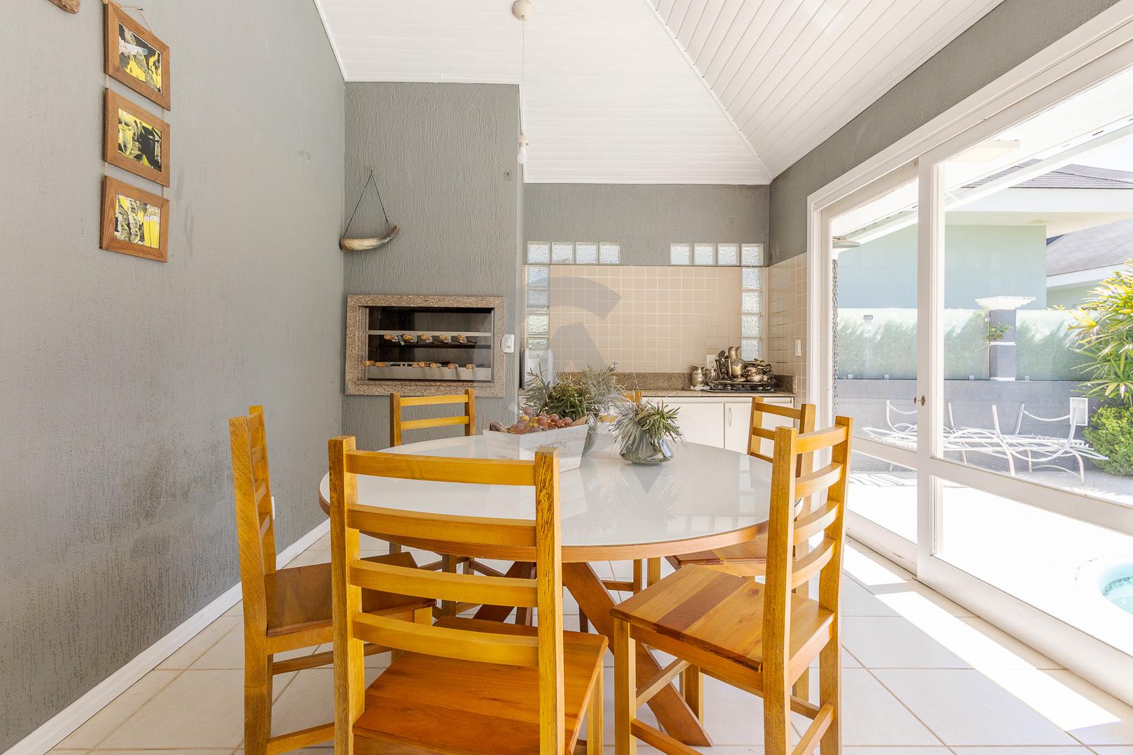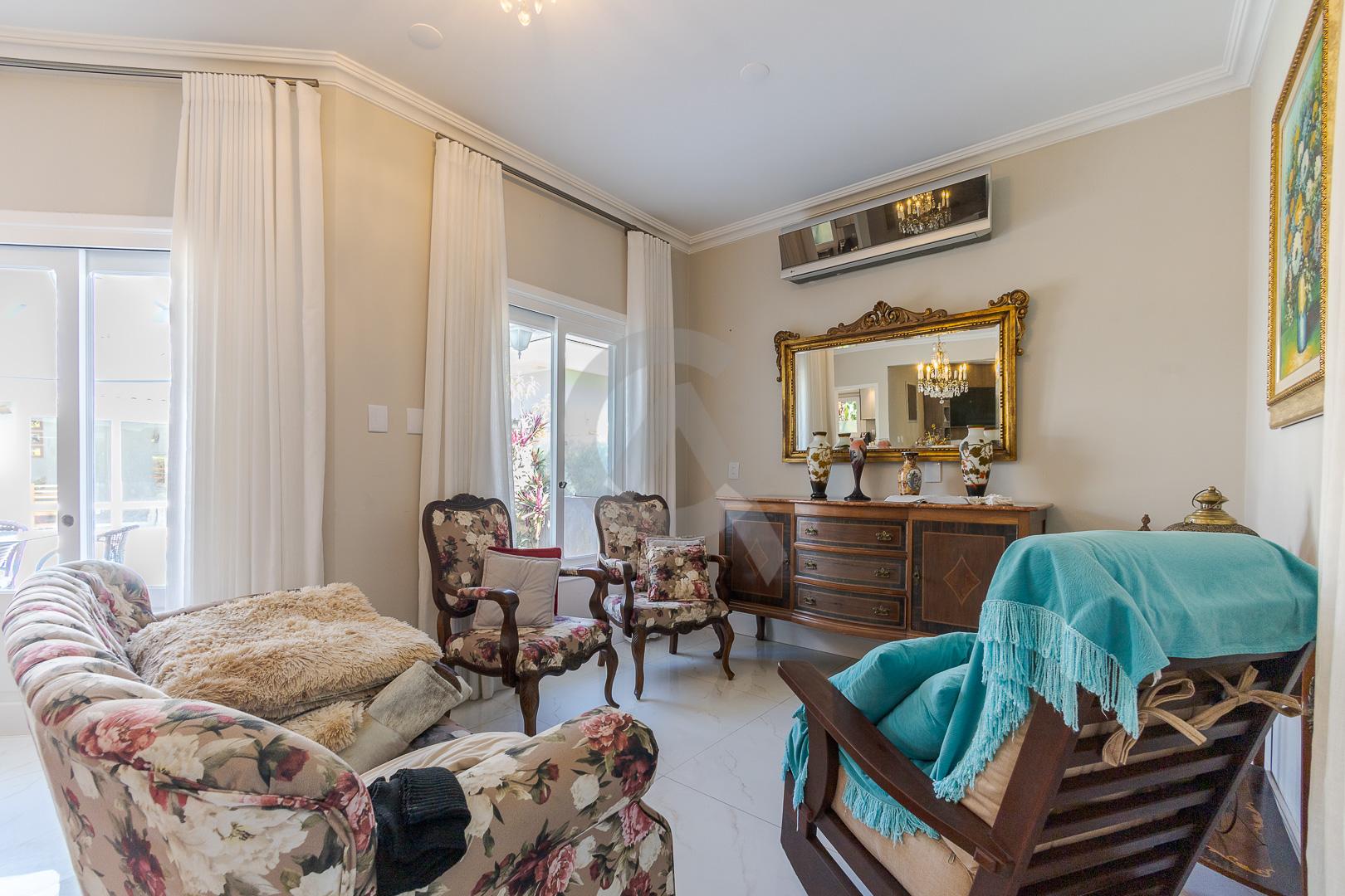 Charmosa casa em condomínio fechado, alto padrão, mobiliado, 4 dormitórios (sendo 1 suíte master com closet e hidromassagem), hall de entrada, escritório, ateliê, cozinha planejada, sala de televisão com lareira, sala de estar, sala de jantar, 4 banheiros, varanda, piscina com cascata de pedra, quiosque com churrasqueira e garagem para 2 carros.