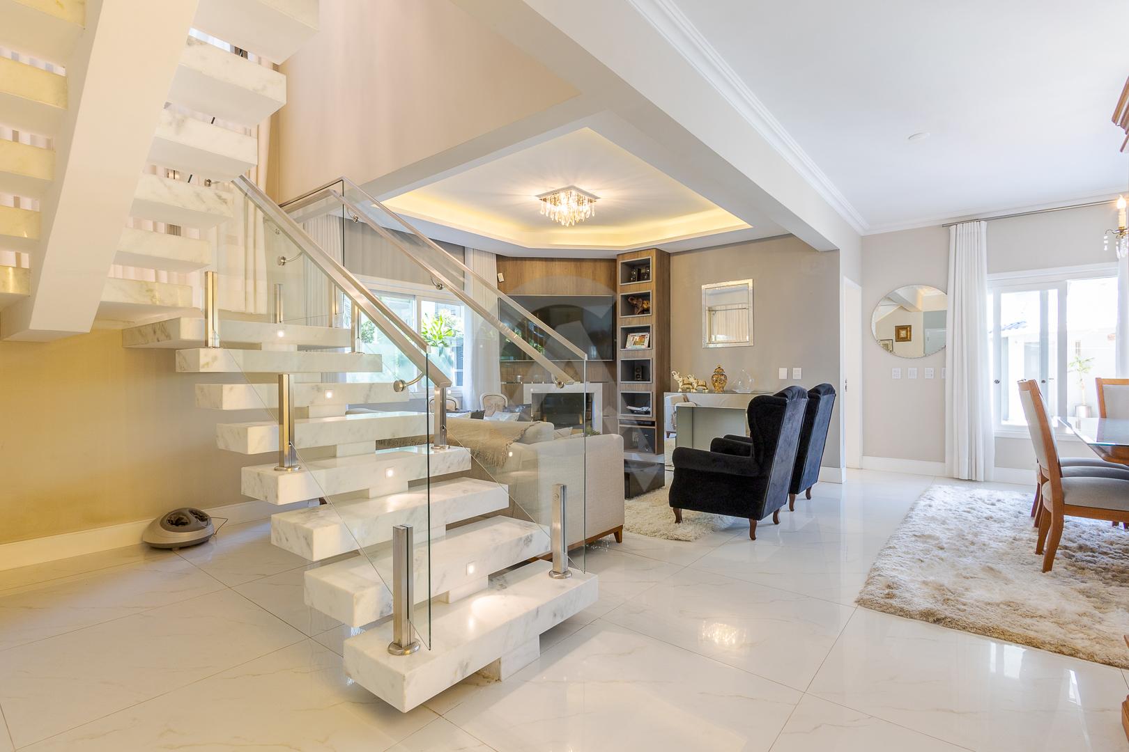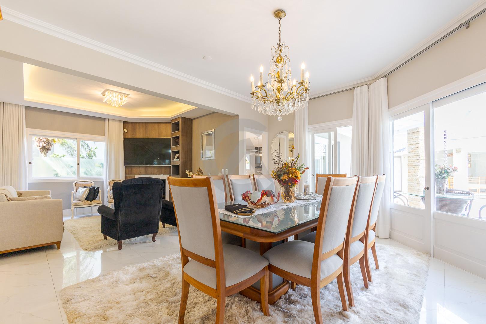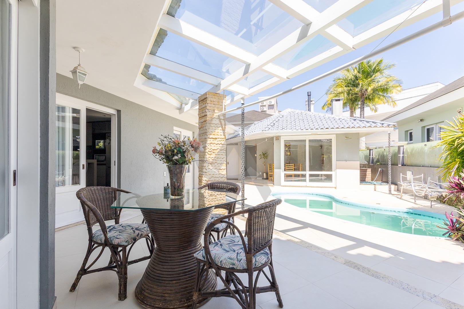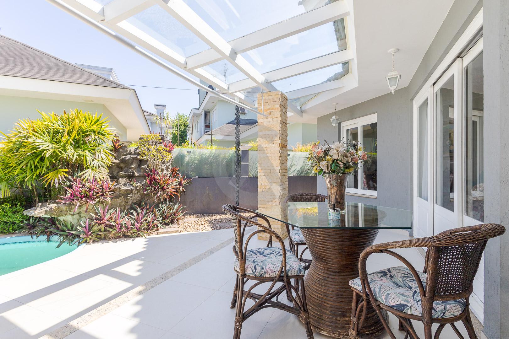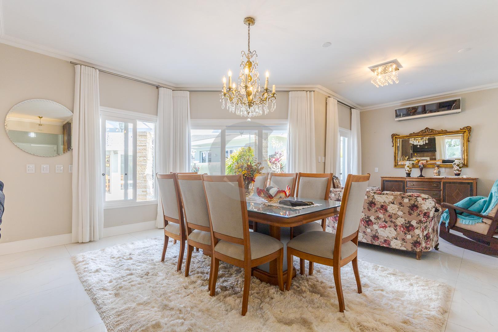 Charmosa casa em condomínio fechado, alto padrão, mobiliado, 4 dormitórios (sendo 1 suíte master com closet e hidromassagem), hall de entrada, escritório, ateliê, cozinha planejada, sala de televisão com lareira, sala de estar, sala de jantar, 4 banheiros, varanda, piscina com cascata de pedra, quiosque com churrasqueira e garagem para 2 carros.
